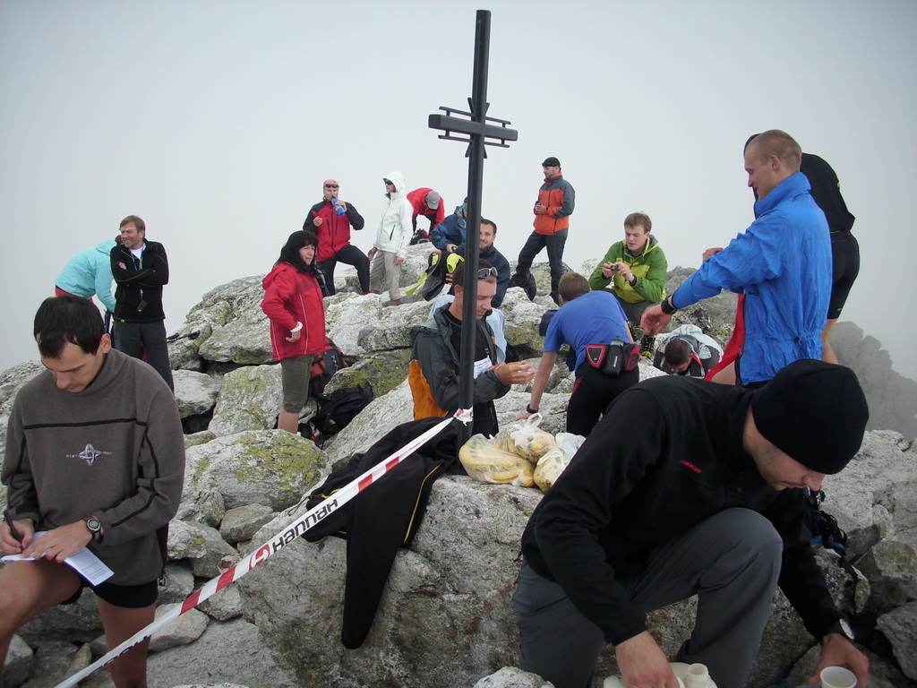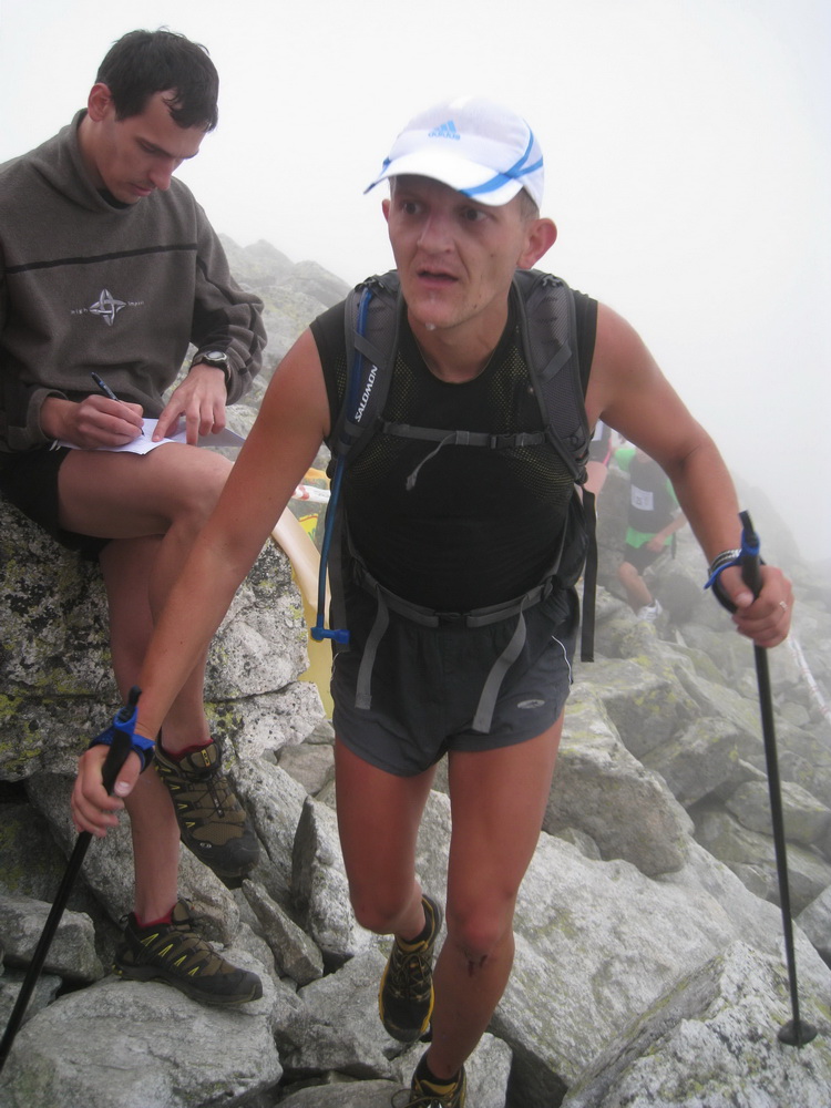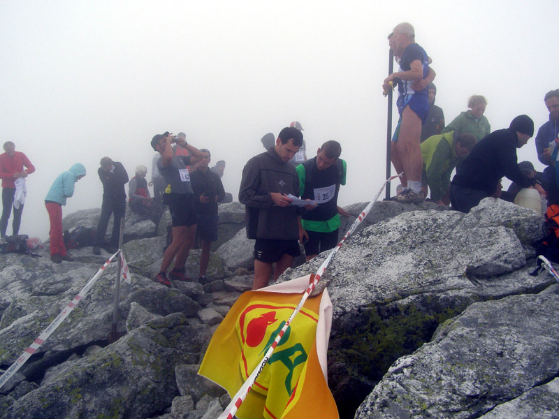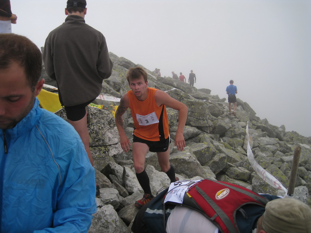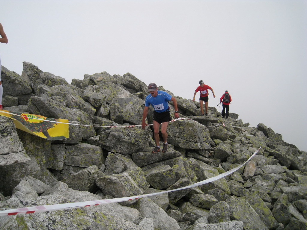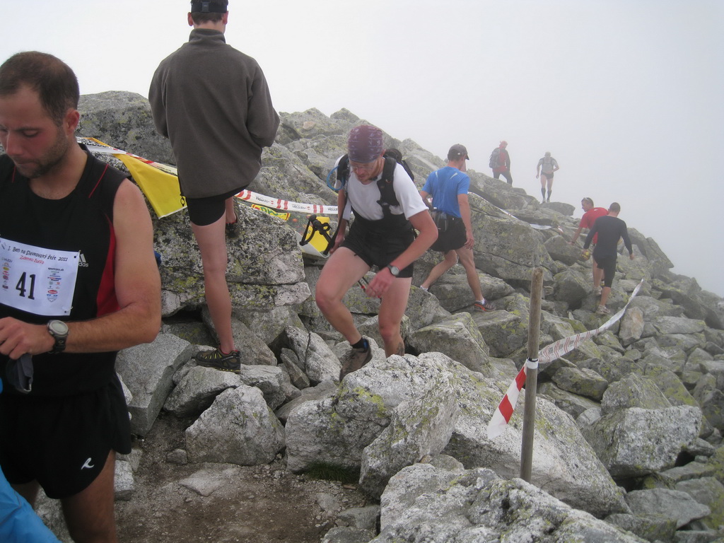 A tak sme sa pred zrakmi udivených sobotňajších turistov, ponevierajúcich sa po Starom Smokovci, rozbehli v ústrety „výživnému kopčeku“, ukrývajúcemu sa v tmavom mraku. „Kam bežia? A to musia?“ začula som ešte otázky od ľudkov, ktorých sme míňali a potom som už radšej zapla MP3. Počas pretekov sa vystriedali skoro všetky druhy počasia. Začalo to ukážkou letnej horúčavy hneď po štarte. Tá vydržala približne po koniec serpentín v lese, potom sa zamračilo a niekde nad pásmom kosodreviny padla milosrdná hmla, ktorá predvídavo ukryla vrchol a cieľ nášho beho-plazenia. A veru dobre sa stalo, pre mnohých by to bol asi veľmi deprimujúci pohľad :-) Neoklamem samu seba ani nikoho keď poviem, že bolo veľa častí, kde sa toho až tak moc nenabehalo a išlo skôr o zrýchlený turistický presun, miestami o ľahší lezecký terén :-) Nechcem samozrejme krivdiť jedincom z prvých priečok, lebo tí isto bežali ako lamy od začiatku do konca. Víťazný Jozef Hlavčo len necelých 65 minút! Ja som sa ťahala pomedzi žulové bloky urputne zaostrujúc na modrú značku a na bežcov, ktorí mizli alebo sa vynárali z hmly predo mnou. „Už sme na Nose“ povedal chalan bežiaci popri mne. Moc ma to nepotešilo. Nemusím mať skúšku z anatómie, aby som vedela že nos od vrchu hlavy je teda dosť ďaleko. Potom som však minula troch zvedavo sa prizerajúcich kamzíkov a vracajúci sa pretekári mi povedali, že som pod posledným výšvihom. Po chvíľke som sa naozaj ocitla v cieli – na vrchole Slavkovského štítu (2452m).