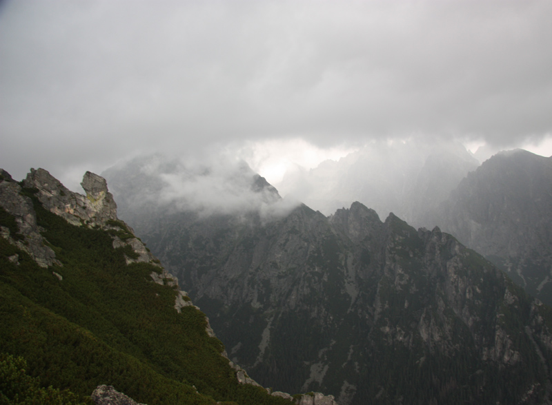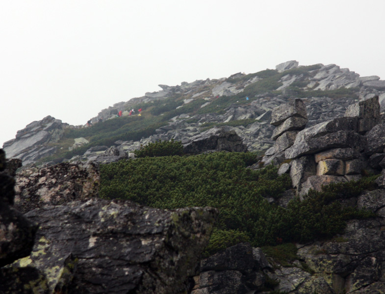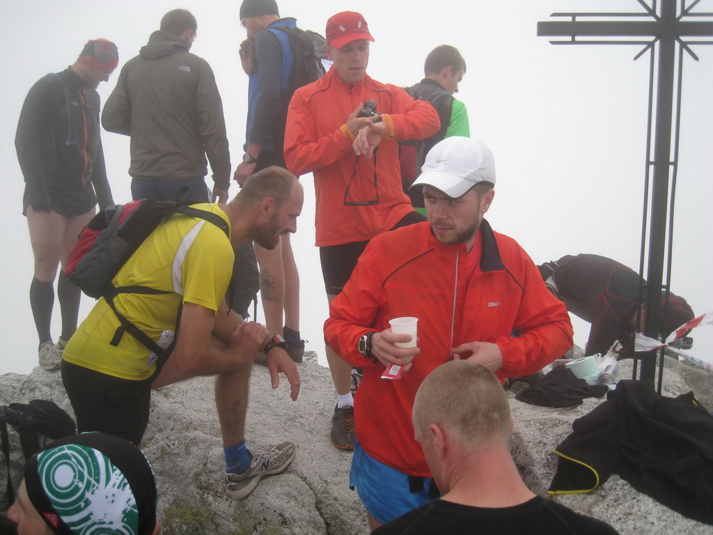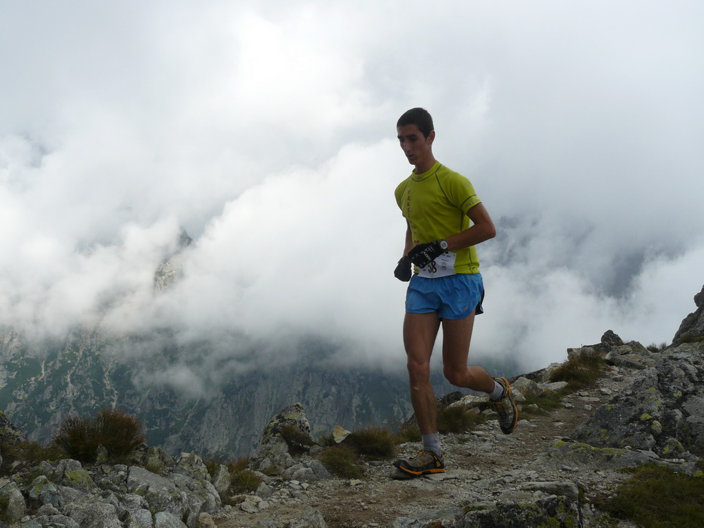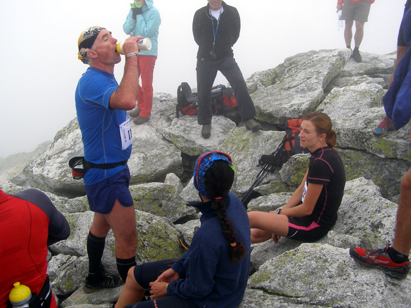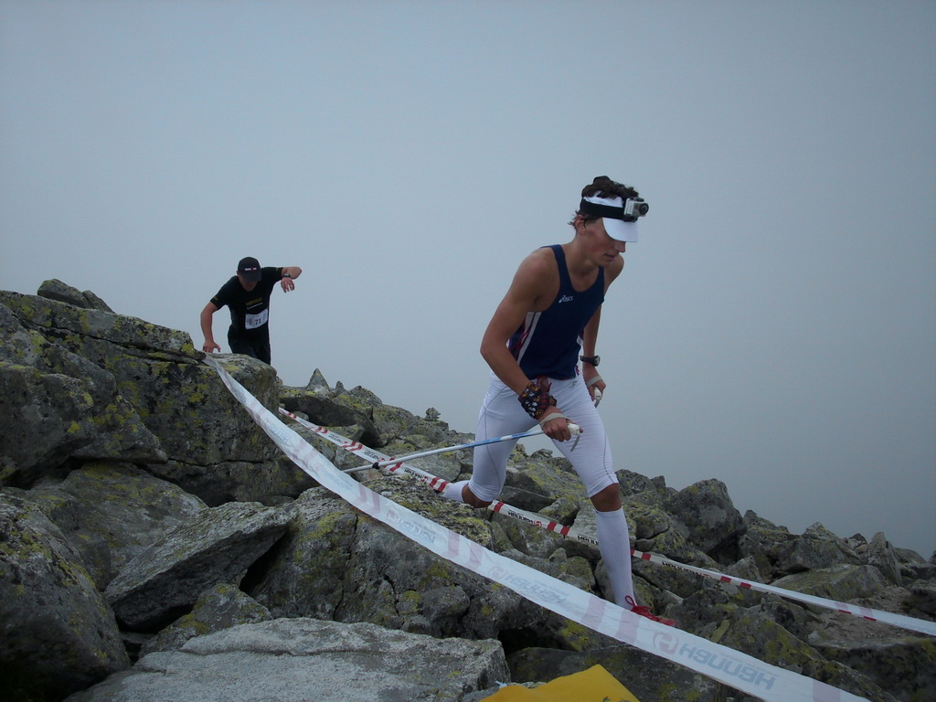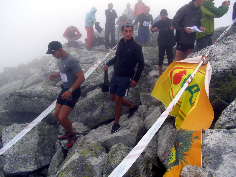 A tak sme sa pred zrakmi udivených sobotňajších turistov, ponevierajúcich sa po Starom Smokovci, rozbehli v ústrety „výživnému kopčeku“, ukrývajúcemu sa v tmavom mraku. „Kam bežia? A to musia?“ začula som ešte otázky od ľudkov, ktorých sme míňali a potom som už radšej zapla MP3. Počas pretekov sa vystriedali skoro všetky druhy počasia. Začalo to ukážkou letnej horúčavy hneď po štarte. Tá vydržala približne po koniec serpentín v lese, potom sa zamračilo a niekde nad pásmom kosodreviny padla milosrdná hmla, ktorá predvídavo ukryla vrchol a cieľ nášho beho-plazenia. A veru dobre sa stalo, pre mnohých by to bol asi veľmi deprimujúci pohľad :-) Neoklamem samu seba ani nikoho keď poviem, že bolo veľa častí, kde sa toho až tak moc nenabehalo a išlo skôr o zrýchlený turistický presun, miestami o ľahší lezecký terén :-) Nechcem samozrejme krivdiť jedincom z prvých priečok, lebo tí isto bežali ako lamy od začiatku do konca. Víťazný Jozef Hlavčo len necelých 65 minút! Ja som sa ťahala pomedzi žulové bloky urputne zaostrujúc na modrú značku a na bežcov, ktorí mizli alebo sa vynárali z hmly predo mnou. „Už sme na Nose“ povedal chalan bežiaci popri mne. Moc ma to nepotešilo. Nemusím mať skúšku z anatómie, aby som vedela že nos od vrchu hlavy je teda dosť ďaleko. Potom som však minula troch zvedavo sa prizerajúcich kamzíkov a vracajúci sa pretekári mi povedali, že som pod posledným výšvihom. Po chvíľke som sa naozaj ocitla v cieli – na vrchole Slavkovského štítu (2452m).