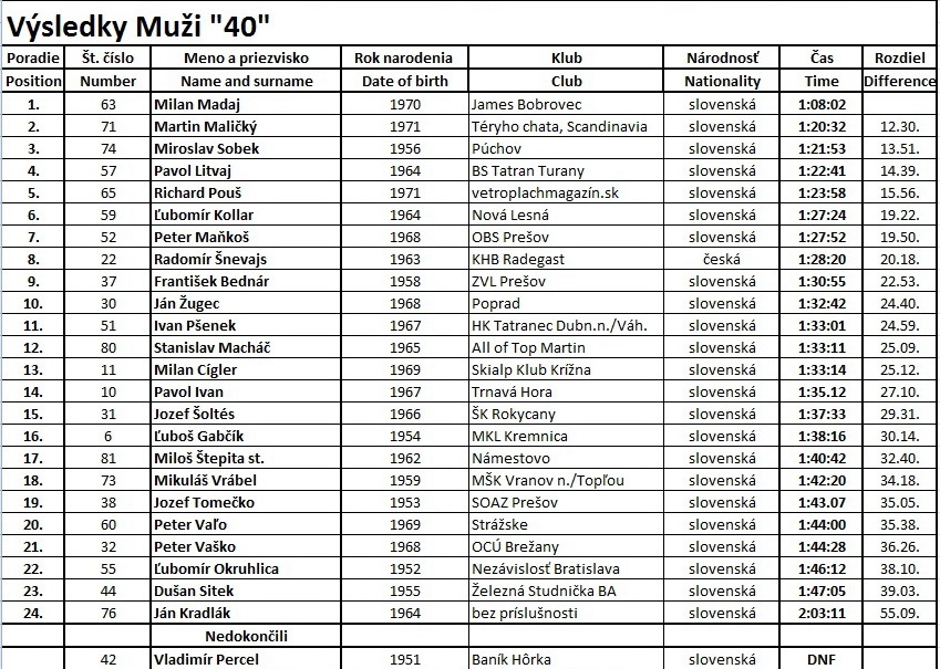 prvých 6 mužov vo veku nad 40 a tak isto aj prvé 3 ženy bez rozdielu